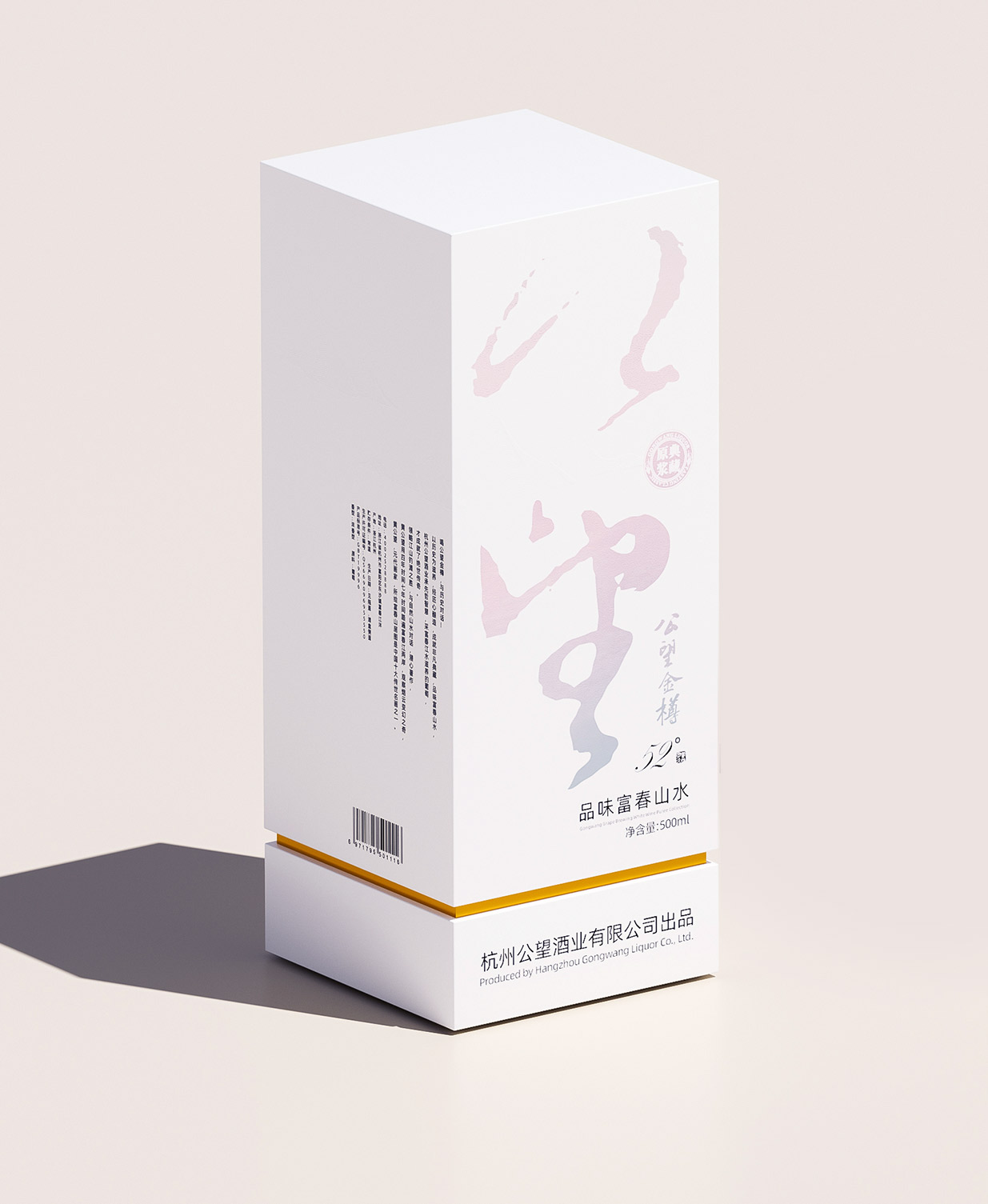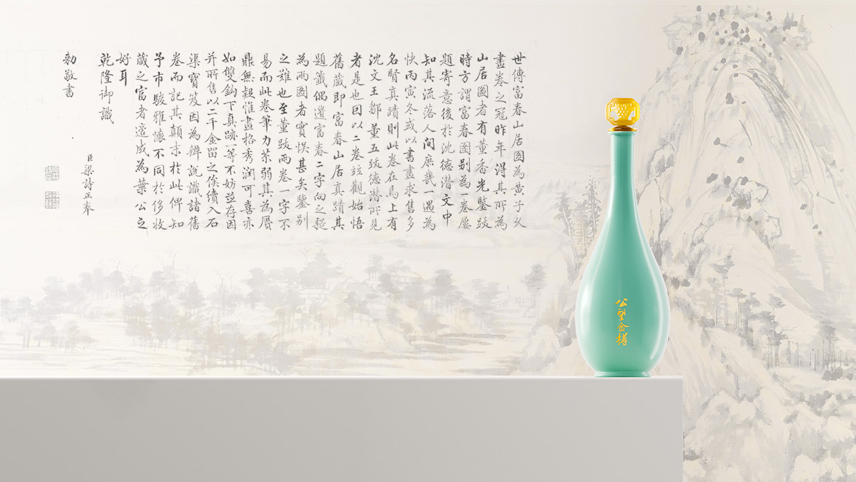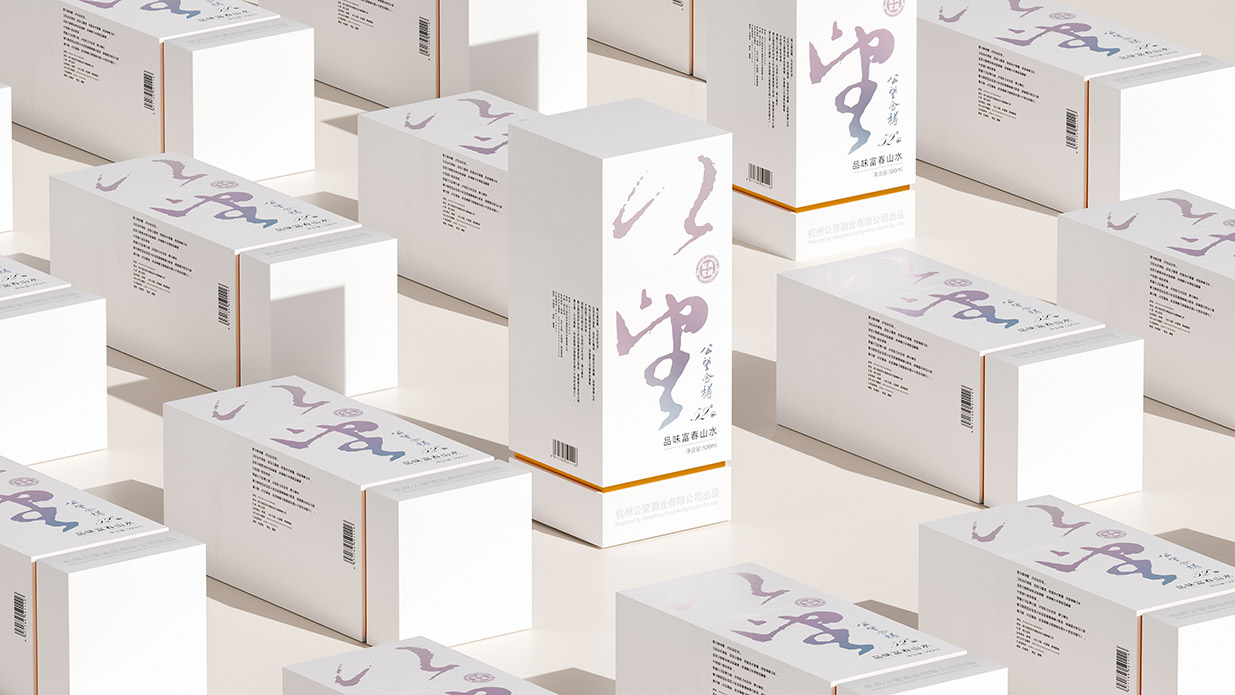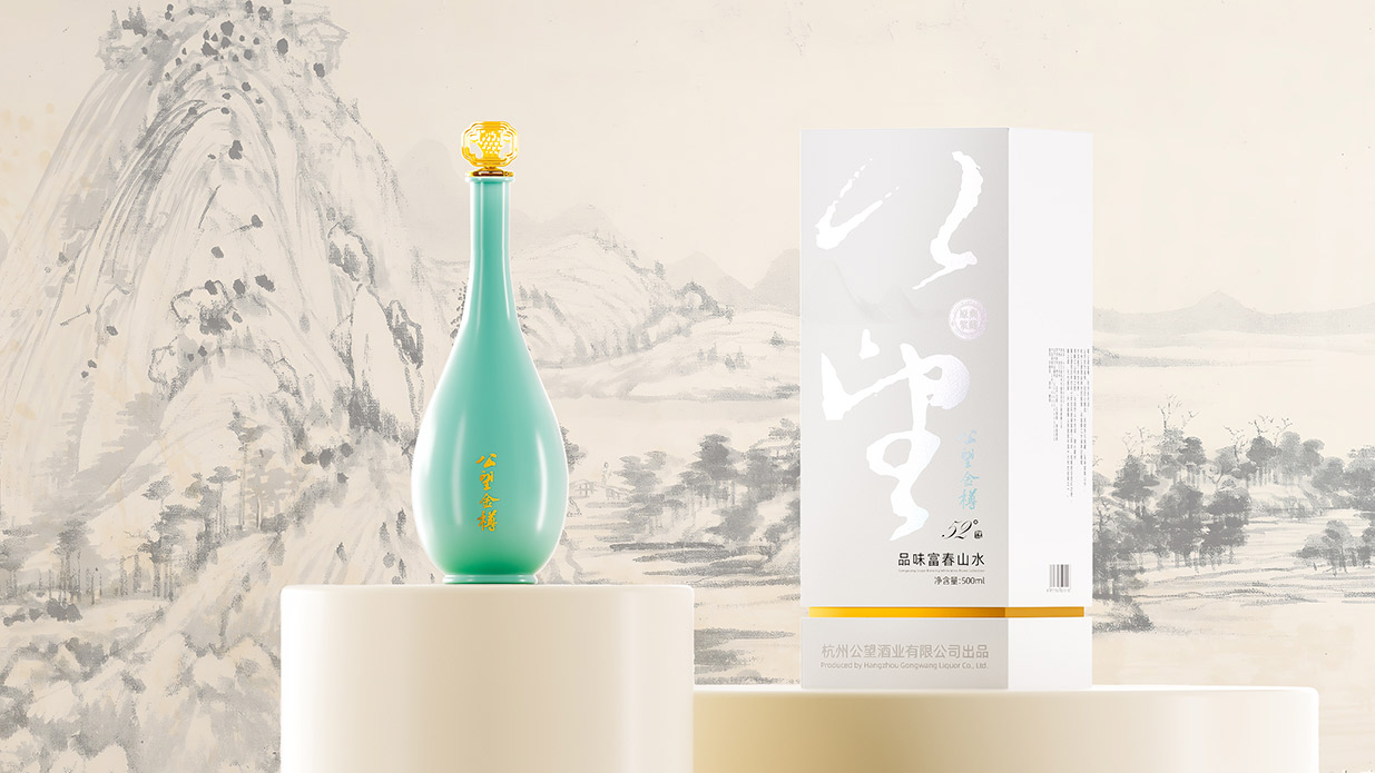 Introduction:公望白酒以其獨特的葡萄釀造工藝脫穎而出,其口感醇正且?guī)в衅咸烟赜械墓悖@種與眾不同的特質為包裝設計提供了豐富的靈感來源。公望白酒的釀造基地位于風景秀麗的富春江畔,這里是元代著名畫家黃公望的故里,深厚的文化底蘊為產品注入了獨特的靈魂。因此,包裝設計的核心理念是借勢地域文化,將傳統(tǒng)文化與現(xiàn)代審美相結合,打造出具有獨特人文氣質的產品形象。